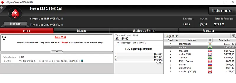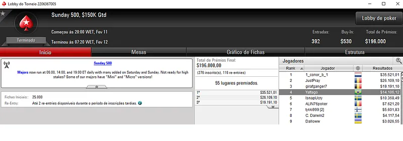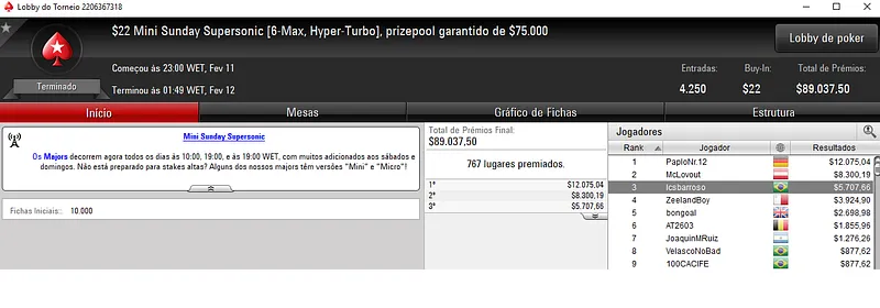 Mas isto não foi tudo. No $22 Mini Sunday Million, 4 brasileiros ficaram no topo da classificação. CannaGrower1 venceu o evento para forrar $25,483, entre os 10,803 participantes. Já glnas terminou em terceiro e recebeu $12,045, enquanto msxiter ficou em quarto para encaixar $8,283.