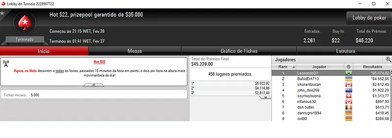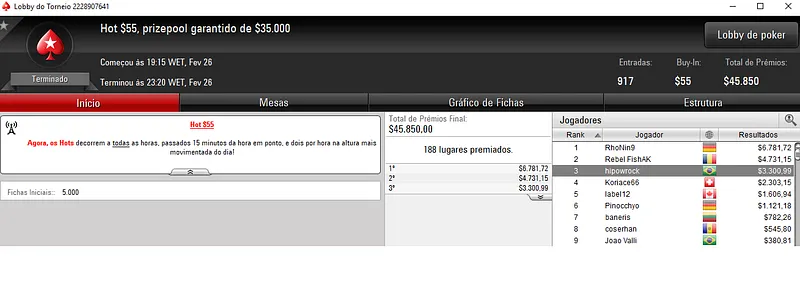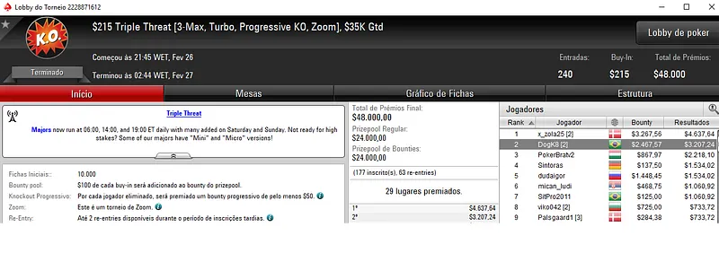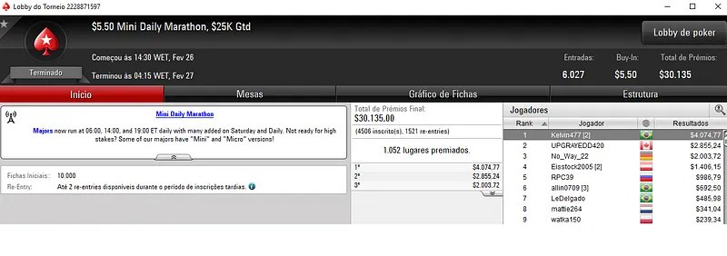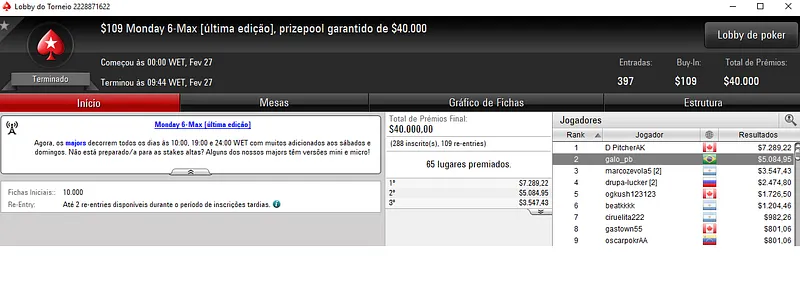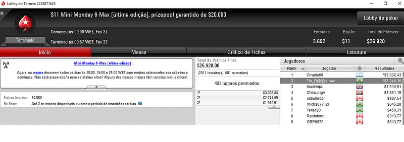 Já na versão mini este evento, o $22 Mini Monday 6-Max viu Guizãoo_ perder na segunda colocação para forrar $9,789. Este evento foi bastante participado e acolheu 4,228 entradas que perfizeram um prize pool de $84,520.