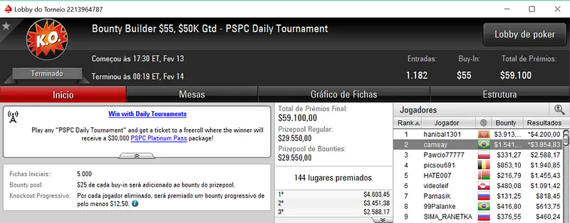 O Bounty Builder $109 viu participarem 1,154 jogadores e com dois brasileiros no pódio. PFL111 cravou o evento para embolsar $15,723, enquanto a medalha de bronze valeu $7,125 a cauee_am.
