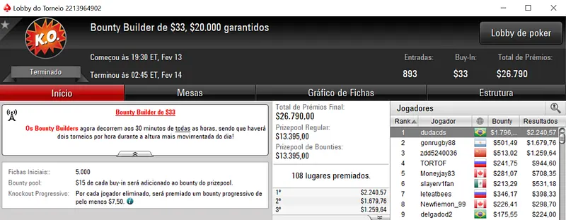Já no Bounty Builder $162 foi a vez de pipou2009 sair com o maior prêmio ao cravar o torneio com 281 jogadores. Pelo título recebeu $10,700.