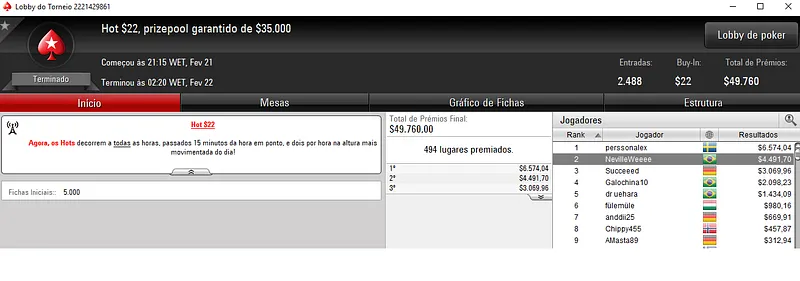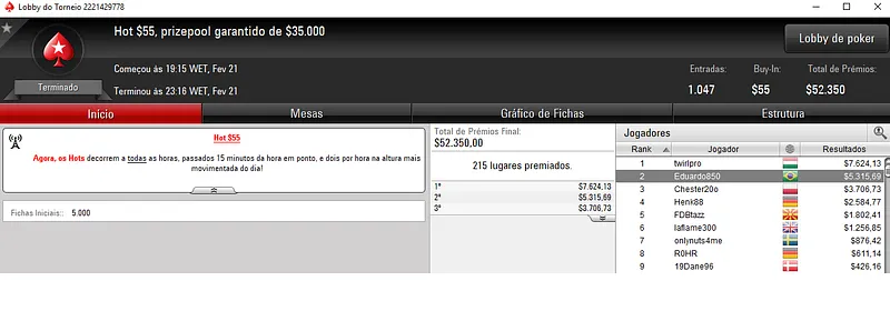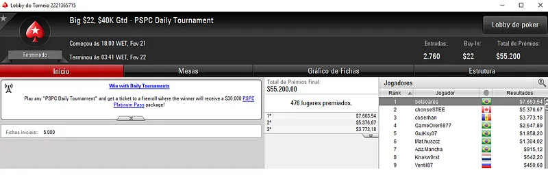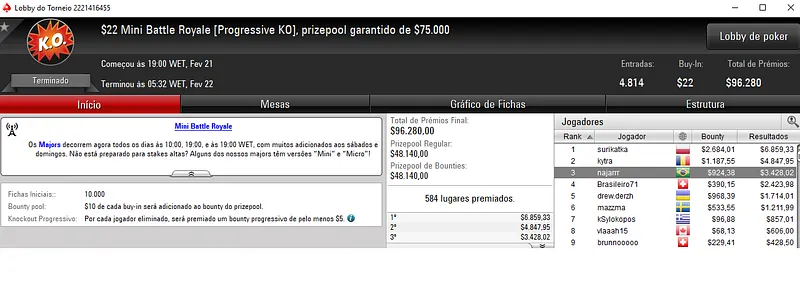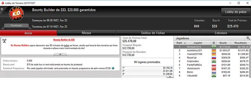 No Bounty Builder $162 só deu Brasil! Este torneio viu o pódio vestir-se de verde e amarelo com PILAATTI a embolsar $9,544 pelo título. Na segunda colocação, macedow recebeu $4,551, enquanto limpnodeic faturou $4,151 em terceiro.