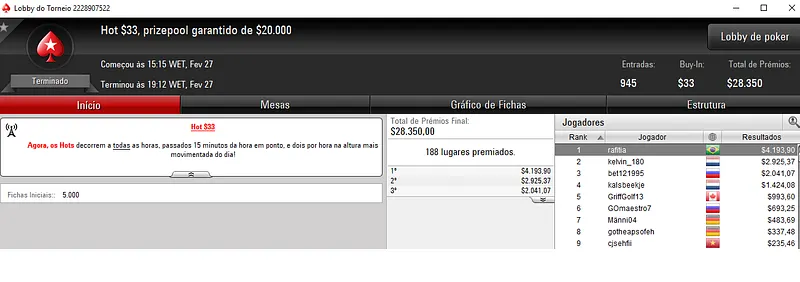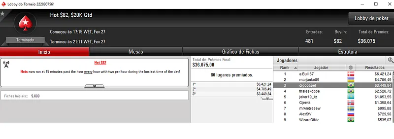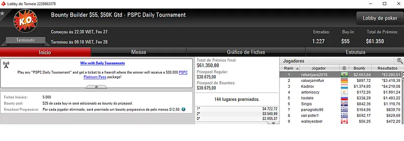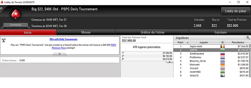 Já Pedro "PaDiLhA SP" Padilha andou dando show na sala da espada vermelha e encaixou dois grandes resultados. Primeiro, terminou o Daily 500 na segunda colocação entre os 203 participantes e embolsou $15,227. Na mesma posição, terminou o $215 Triple Threat para mais $4,527.