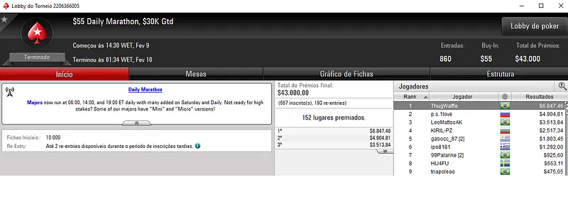 Já no Big $55 com 1,050 entradas e $52,500 de prize pool, Geraldo "GeraldoCesar" Cesar Neto voltou a aprontar e a embolsar $8,147 pelo título de campeão.