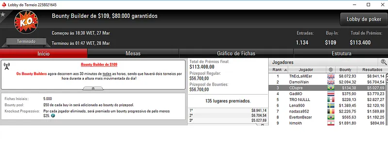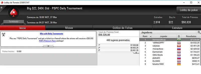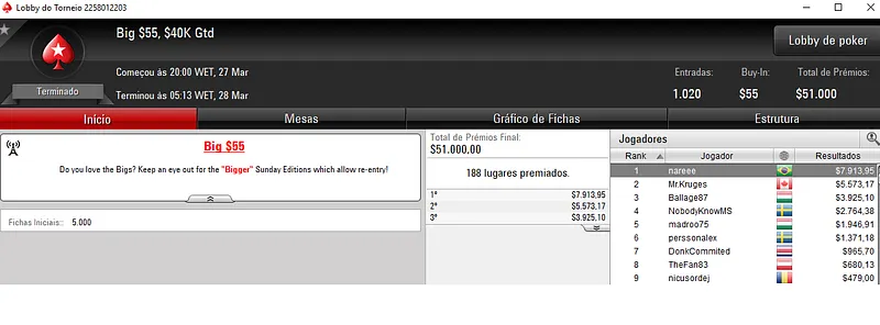 O melhor jogador entre as 117 entradas regitradas no Daily 500 foi Surviver101 que deixou para trás. O jogador brasileiro levou para o caixa $12,822 de premiação, dos $58,500 acumulados e repartidos pelos 17 melhores classificados.