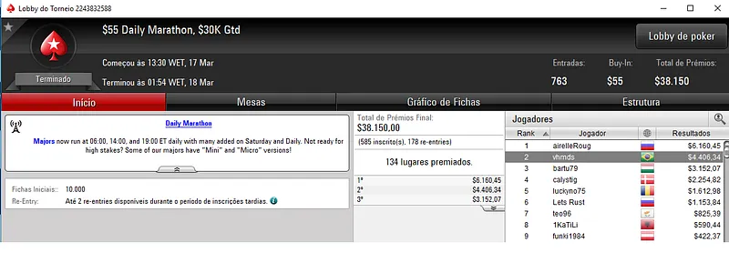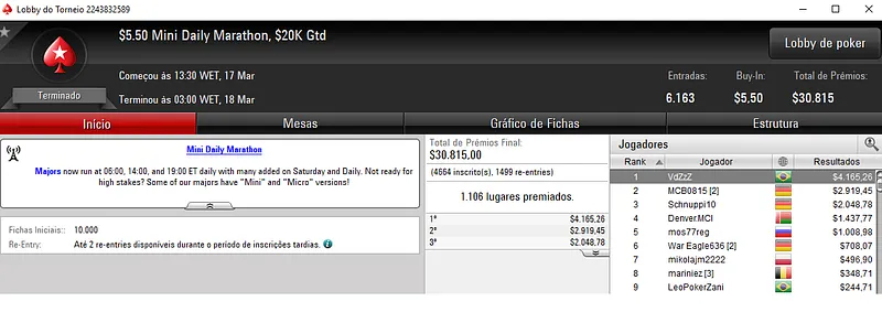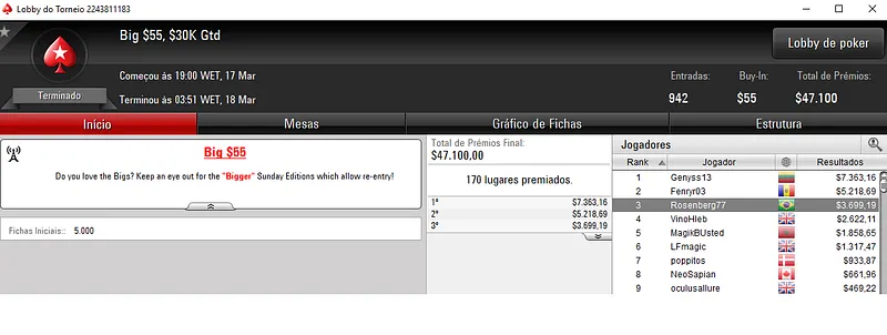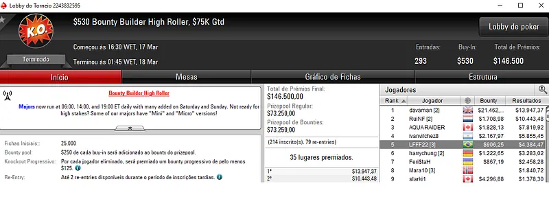 Já no Bounty Builder $33 houve nova cravada brasileira com bernar.serra a sair com $8,595. Para trás ficaram 3,336 adversários que perfizeram um prize pool total de $100,110.
