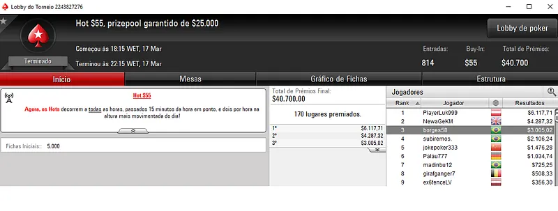 Já kroko 2008 forrou $5,889 pela segunda colocação no Hot $109 com 447 jogadores e $44,700 de prize pool. O nosso representante apenas foi parado no heads-up, neste evento que distribuiu premiação pelos 71 melhores classificados.