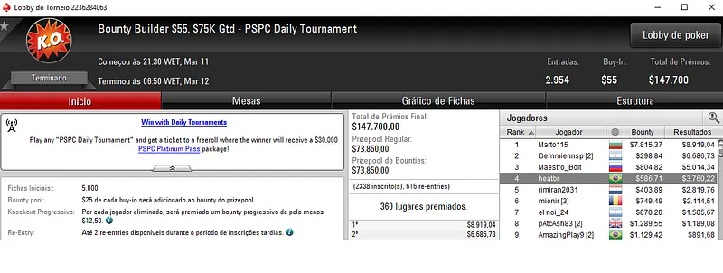 Noutro Bounty Builder, desta vez de $109, Paulo "pvss" Silva deu também a cravada e encaixou $30,526, entre prêmio e bounties. O torneios teve a participação de 3,313 jogadores, com o prize pool a chegar aos $331,000.