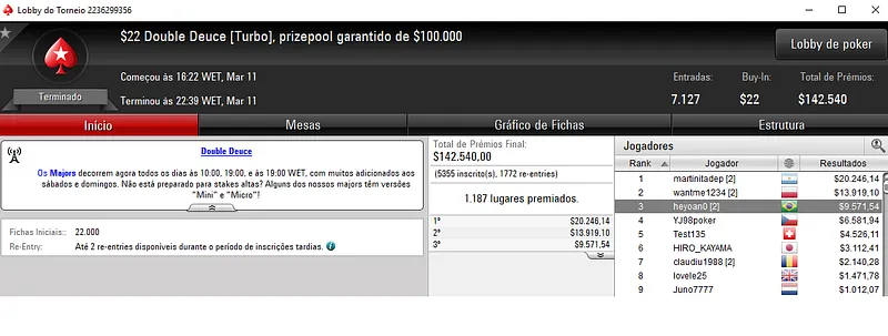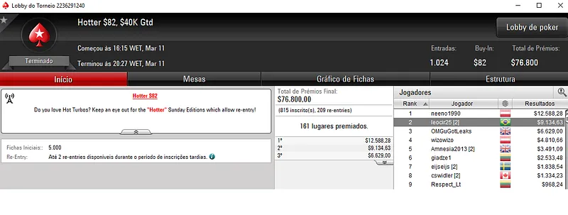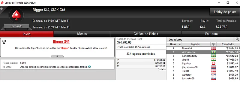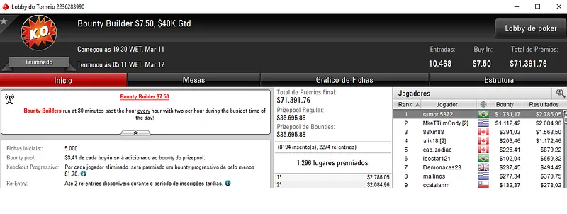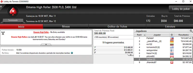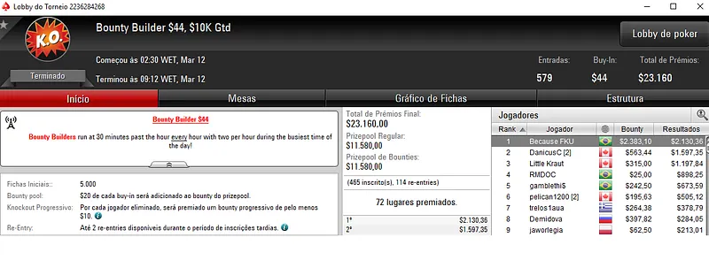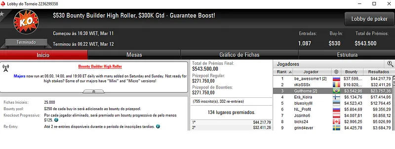 Já a cravada no Bounty Builder $215 rendeu $31,437 a Renan "Aziz.Mancha" Aziz. O jogador brasileiro deixou todo o mundo para trás, cerca de 1,042 adversários e saiu com o título neste torneio que teve um prize pool acumulado de $208,600.