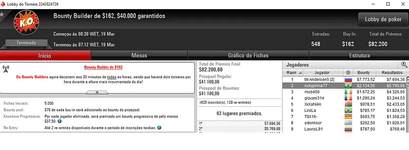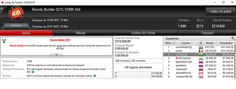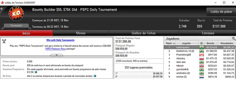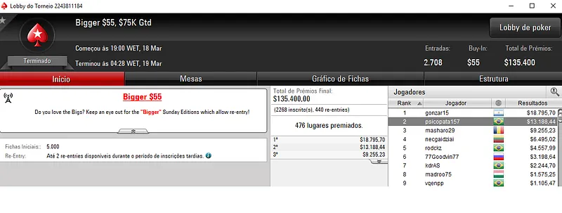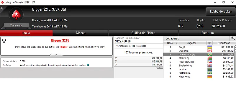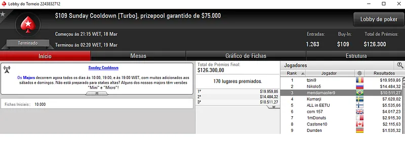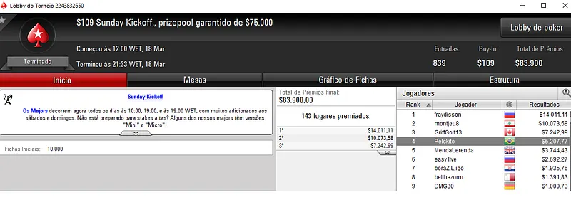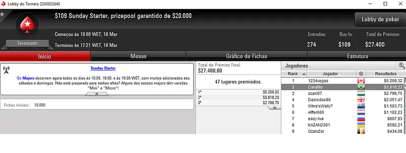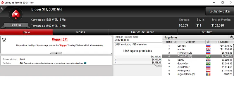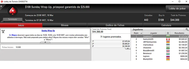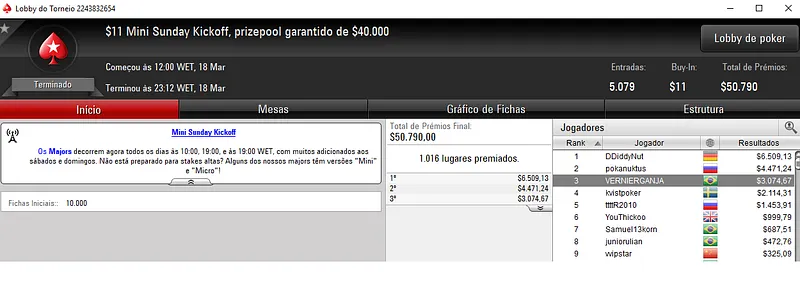 Já no Mini Sunday Million com 11,328 jogadores houve dobradinha brasileira. Com o título lunaardi encaixou $20,916, enquanto no segundo lugar GusLaden ficou com $17,320. Os jogadores fizeram acordo no 3-handed.
