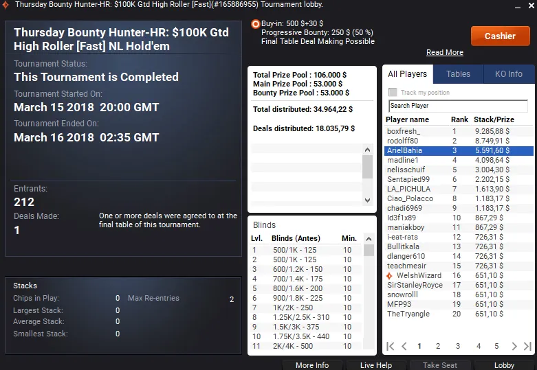 Já brunojardas1 teve dois grandes resultados. A cravada no Bounty Hunter 6-Max Turbo-H deu direito a $5,454.
