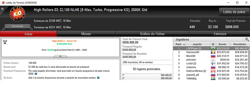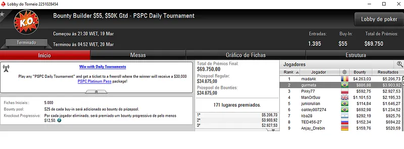 Também no Bounty Builder $162 houve nova cravada verde e amarela, onde ramonnce encaixou $10,124 de premiação. Para trás ficaram 349 jogadores.