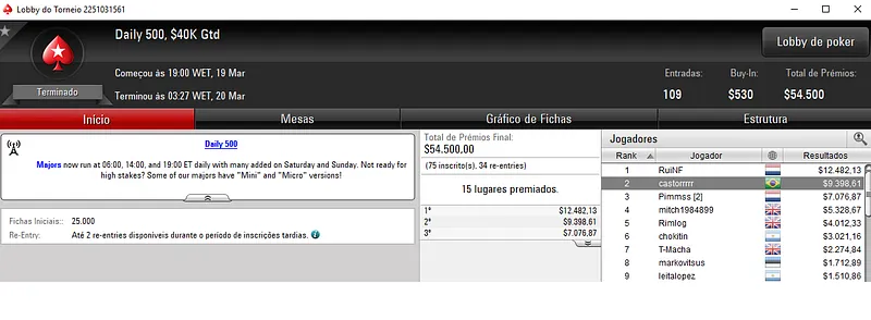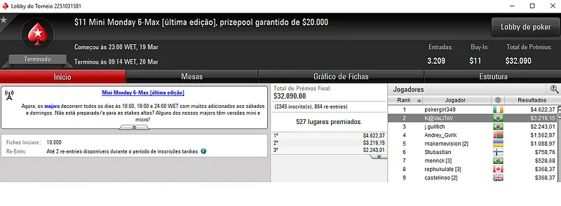 Com 661 entradas o $215 Monday 6-Max teve um prize pool acumulado de $132,200, onde 107 jogadores saíram com prêmios. Com a medalha de prata, Diogo "offQbert45" Ferreira conseguiu mesmo a maior forra do dia e embolsou $15,938. O nosso representante apenas foi parado no heads-up pelo dinamarquês IgorKarkarof.