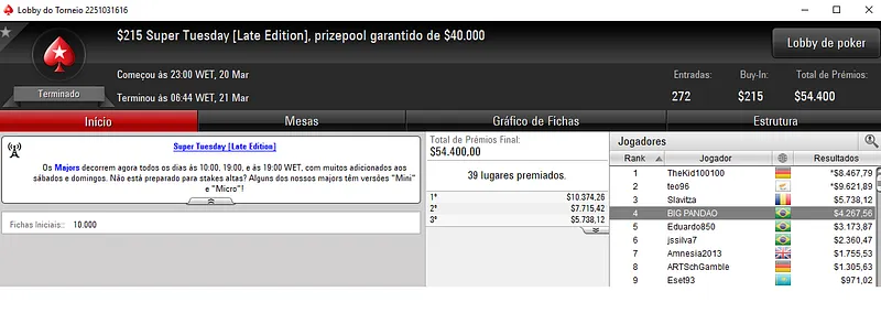 A Super Tuesday do PokerStars foi mesmo super para os jogadores de poker online nacionais. Foram vários os que conseguiram grandes premiações nos torneios regulares da maior sala de poker online do mundo.