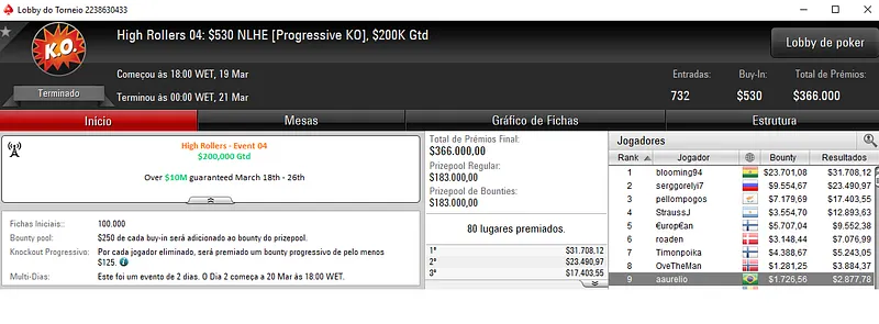 Já no Bounty Builder $33 com 2,808 jogadores e $84,240 de prize pool, Gustavo "MachadinhaRS" Rocha deu a cravada e embolsou $8,391, entre prêmio e bounties.