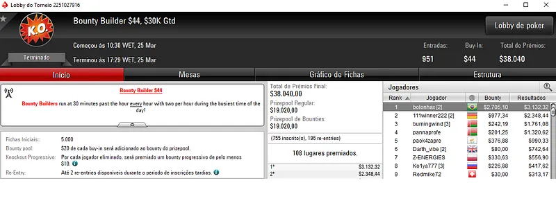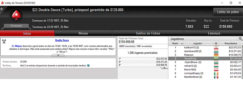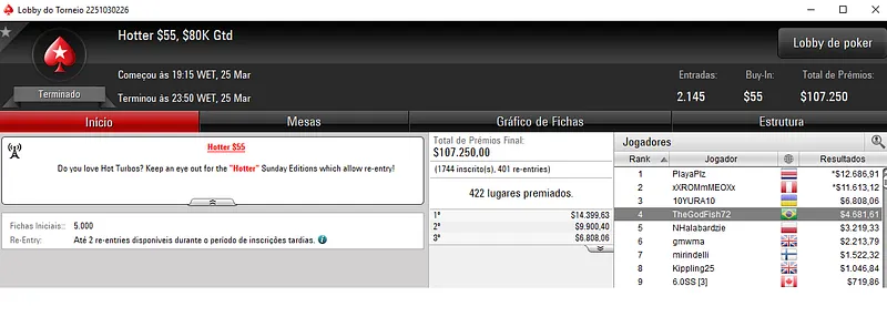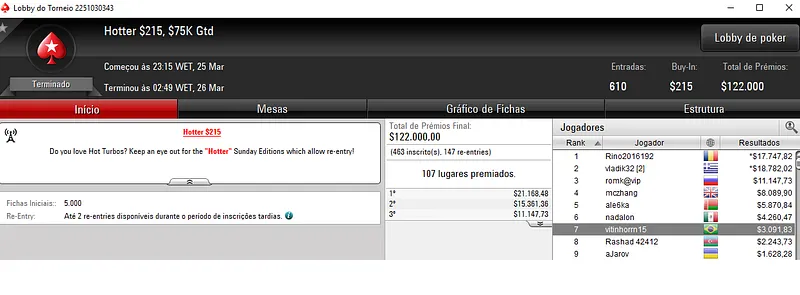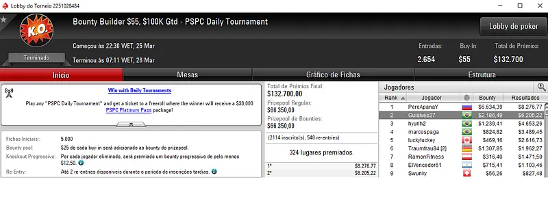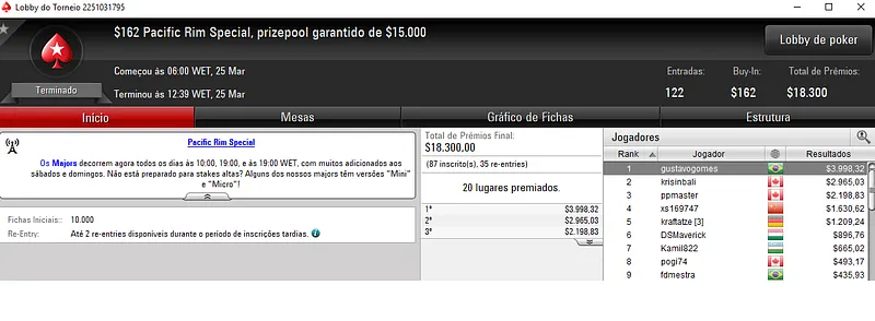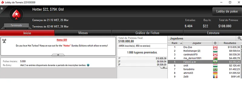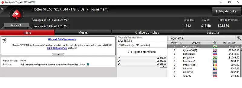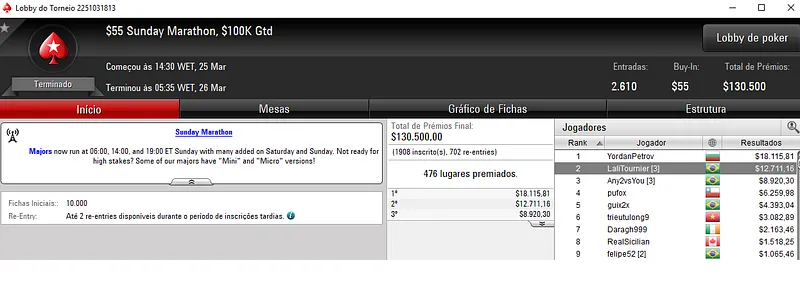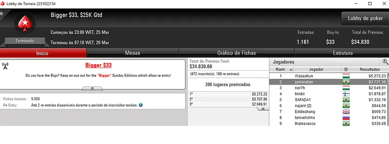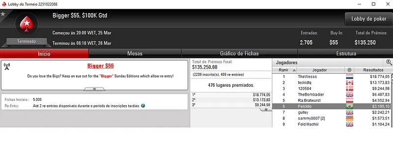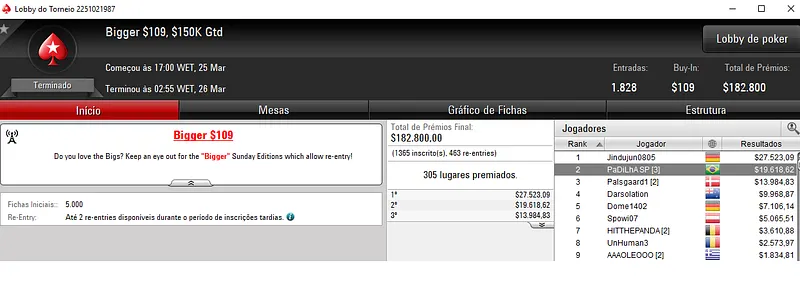 A dobradinha apareceu no Sunday Storm com 28,535 entradas e $285,350 de prize pool. O campeão foi rpfeifer77 que embolsou $25,863. Na segunda posição, WLAMIR terminou em segundo e forrou $17,765.