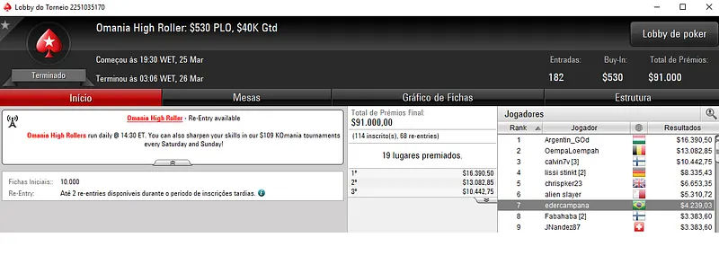 Já Luan "Pseudo Fruto" Felipe conseguiu chegar na mesa final do Sunday Million e foi recompensado com $40,778 pela quarta colocação.