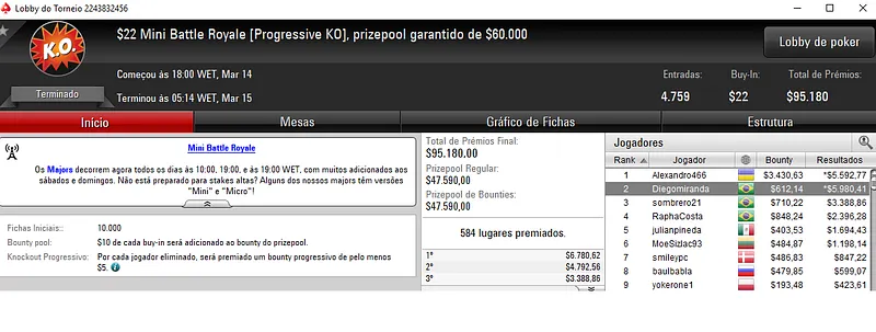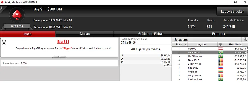 THE ONLY SON também esteve em destaque e encaixou mais $8,291 depois de ultrapassar 211 adversários no Hot $215. O jogador verde e amarelo foi mesmo o melhor classificado e levou a maior fatia dos $42,400 de prize pool acumulado.