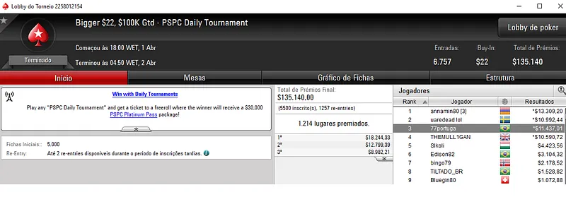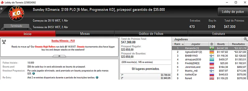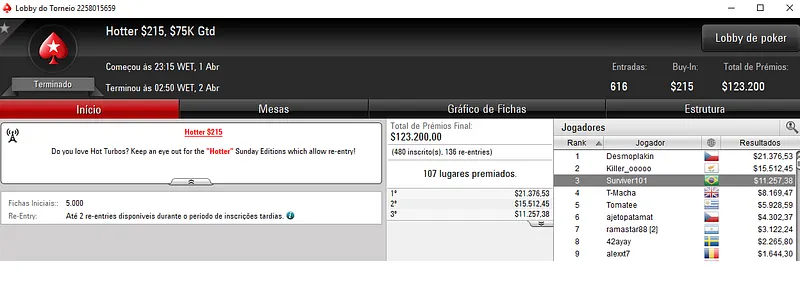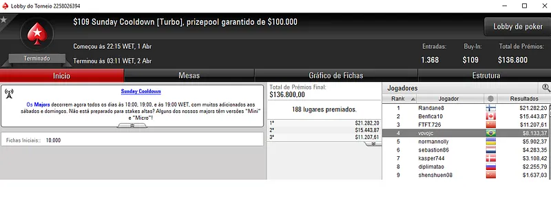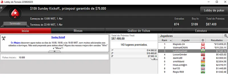 Além do grande resultado no partypoker, João "IneedMassari" Simão ainda chegou no pódio do Sunday High Roller com 128 jogadores. A medalha de bronze valeu $32,468 dos $256,000 prize pool acumulado.