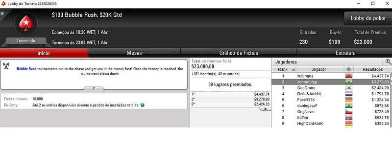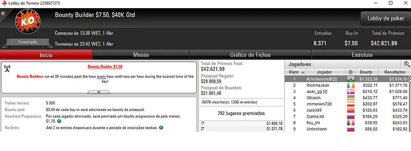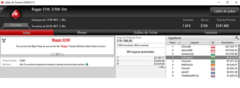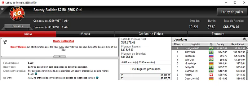 Já a cravada no Bounty Builder $215 com 1,065 jogadores ainda deu direito a mais $29,168. Aqui o prize pool cehgou aos $213,000.