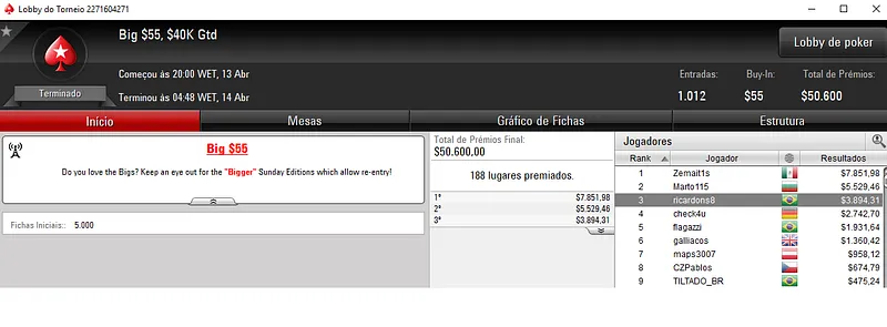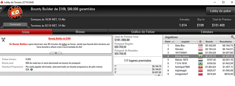 Já no Bounty Builder $44, novonunes levou para o caixa $7,724, depois de deixar para trás 1,661 adversários. O prize pool deste evento chegou nos $66,480 e o hino verde e amarelo tocou.