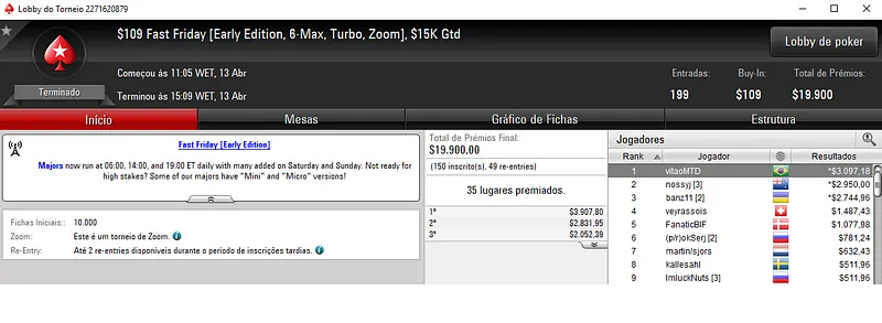 Sexta-feira 13 deu sorte para vários grinders nacionais nos panos virtuais do PokerStars. Muitos dos nosso jogadores embolsaram boa forras. Como foi caso de Bruno GT que com a medalha de prata no Bounty Builder High Roller levou para o caixa $13,483. Este torneio contou com 267 entradas e o prize pool acumulado foi e $133,500.