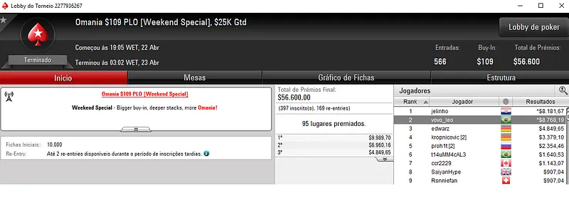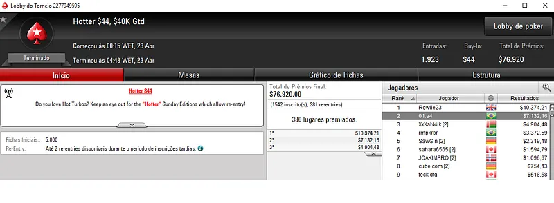Tal como o Mini Sunday Million, o Hotter $109 também viu o pódio vestir verde e amarelo. Yago "yhsimplicio" Simplício ficou com amedalha de ouro e recebue $27,387. No segundo lugar, Grande_Prego forrou $19,522, enquanto Thales "thaleskoppe" Koppe ficou com o bronze e $13,915 de premiação.