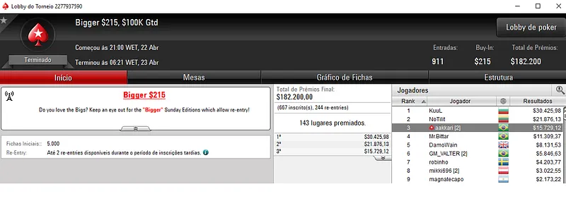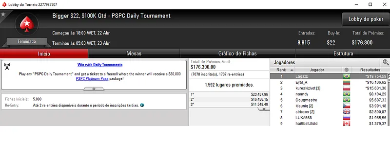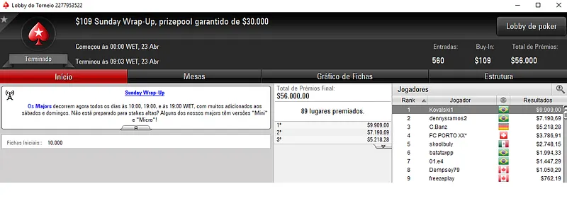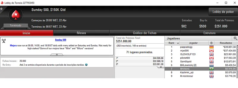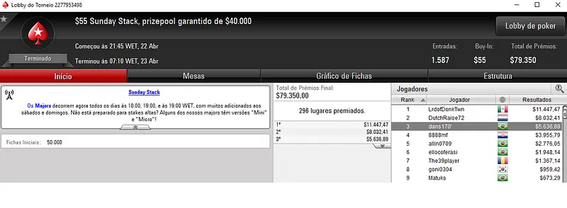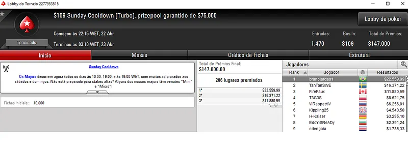 Já no $22 Mini Sunday Million, o pódio ficou vestido de verde e amarelo, com três jogadores nacionais nos três primeiros lugares do torneio com 13,908 jogadores e $278,160 de prize pool. O campeão foi EliotNeto que levou para o caixa $31,143 de premiação. O segundo lugar ficou para CamilaS473 que embolsou $21,407, deixando a medalha de bronze para leosande que forrou $14,720.