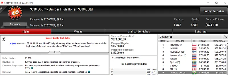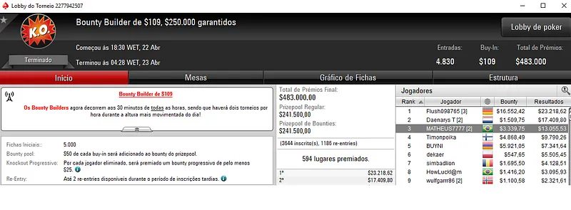 Mas não foi tudo, o craque ainda dividiu a premiação no heads-up do Hotter $22 e encaixou mais $13,254. O segundo lugar ficou para Caio "CFAlmeida" Almeida que recebeu o mesmo prêmio. Este torneio teve 6,139 entradas e o prize pool chegou aos $122,780.