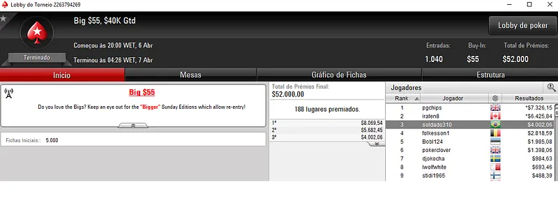 A maior forra apareceu com a segunda colocação de naformadalei no $215 Fast Friday [6-Max, Turbo, Zoom]. O jogador brasileiro chegou a acordo no heads-up e encaixou $10,206 de premiação. Foram registradas neste torneio 323 entradas e o prize pool chegou aos $64,600.