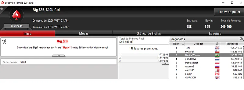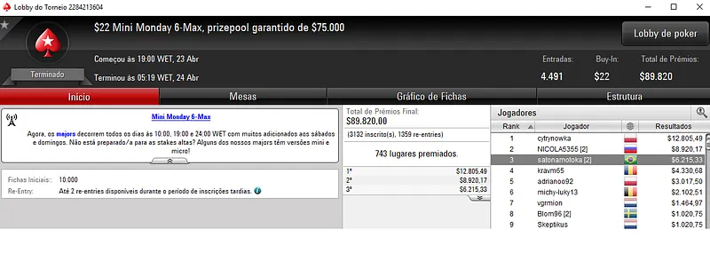 O maior resultado aconteceu no Monday 6-Max [Late Edition] com o buy-in de $109 e 520 entradas. O prize pool chegou aos $52,000 e na segunda colocação, reyals_rs faturou $7,857 depos de chegar a acordo no heads-up.