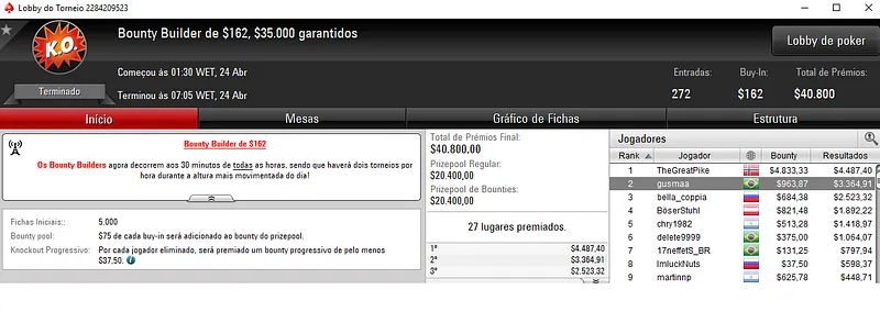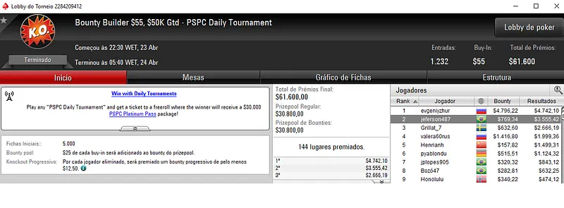 Também com a medalha de prata, KKing James embolsou $67,123 no Bounty Builder $215. Aqui participaram 344 jogadores e o prize pool chegou aos $68,800. Com a medalha de bronze, novonunes teve direito a $5,377.