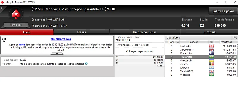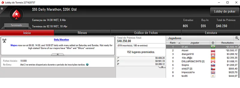 Já no Big $55 com 903 jogadores, o prize pool chegou aos $45,150 e o campeão foi o jogador verde e amarelo leofarah19 que levou para o caixa cerca de $7,058 de premiação.