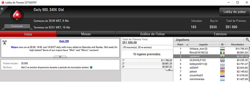 A medalha de bronze no Daily 500 valeu $6,687 a castorrrrr. Este torneio conta sempre com muitos dos craques online e ontem contou com 103 entradas e $51,500 de prize pool.