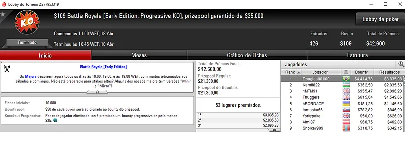 No torneio do dia, o Battle Royale com 1,001 participantes, o Brasil contou com dois jogadores na mesa final. A quarta colocação valeu $13,002 a João Paulo "tiltinha" Gomides, enquanto o nono lugar deu $4,558 a AfranioMM.