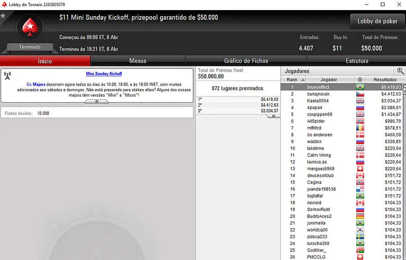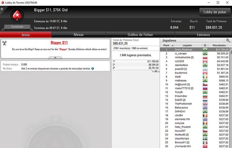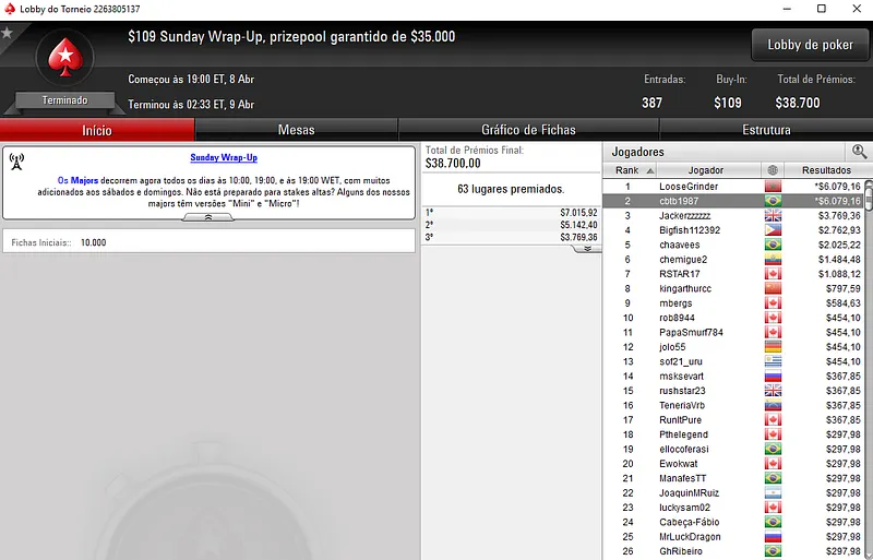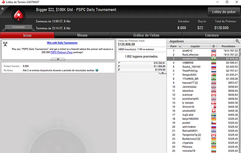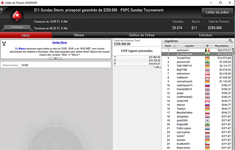 Também no Sunday Storm o Brasil esteve no pódio. Com a medalha de prata, je_menegotto teve direito a $14,270 depois de fazer acordo no 3-handed. A quarta colocação ficou para guirusso22 que saiu com $7,436 entre os 25,374 participantes.