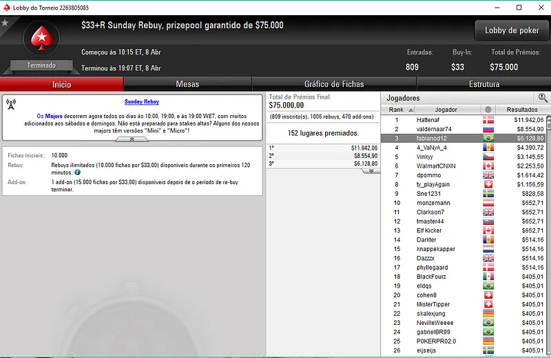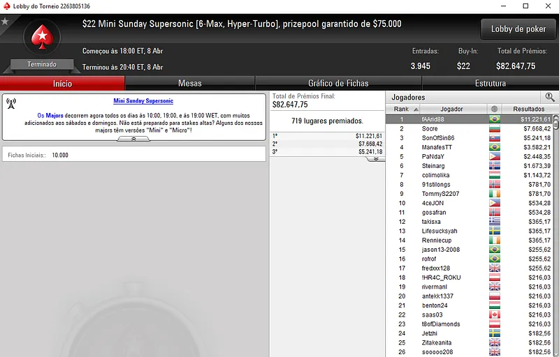 O jogador brasileiro cravou o $215 Sunday Supersonic e embolsou $26,759 de premiação. Participaram neste torneio cerca de 775 jogadores e o prize pool chegou aos $158,689.