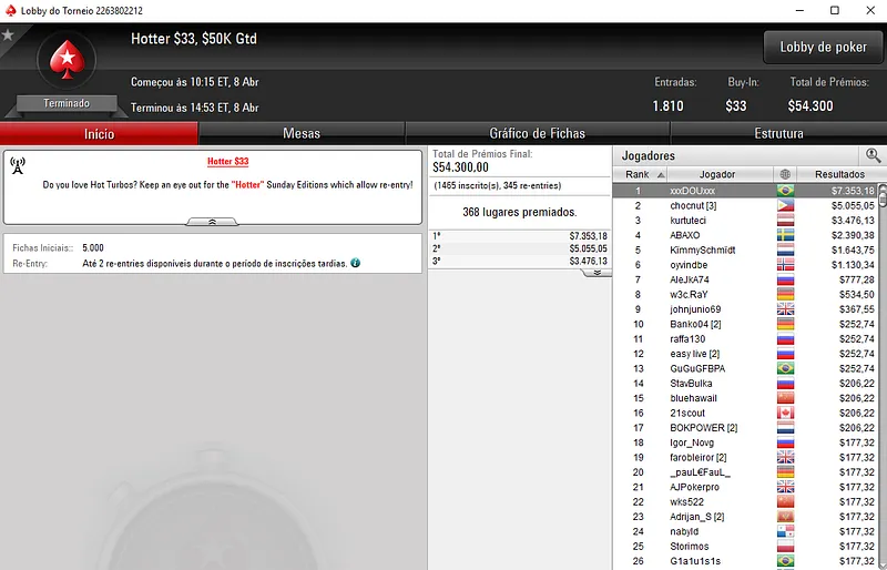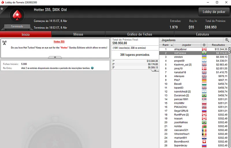 Já no Hotter $22, Vitor voltou a triunfar. Aqui foram registradas 4,885 entradas e o prize pool chegou nos $97,700. A medalha de ouro valeu mais $12,519. O heads-up foi disputado contra gabrielbdo23 que encaixou $8,604.