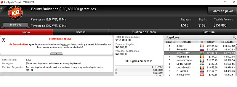 Já no Bounty Builder $33 com 3,168 participantes, o título veio para o Brasil, com royalmaf67 a embolsar $9,766. Este torneio distribuiu $95,040 de premiação.