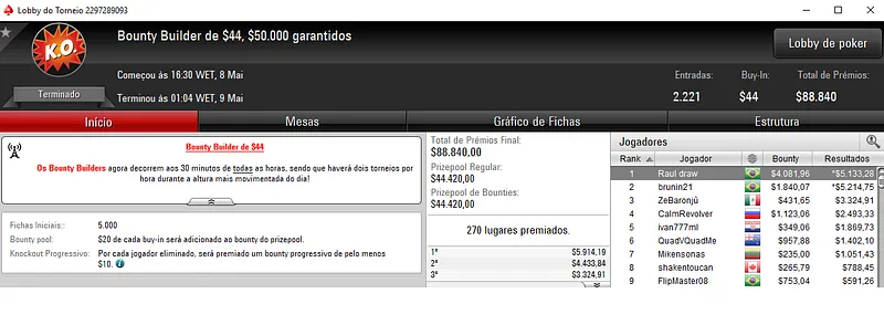 O maior resultado apareceu com a cravada de Catholovisck no Bounty Builder $109. O jogador nacional enfrentou 1,757 adversários e saiu com o título e $19,475 de premiação. Este torneio teve um prize pool acumulado de $175,800 e na quinta colocação Gustavo "gremistaAK" Pinto levou para o caixa cerca de $6,493, entre prêmio e bounties.