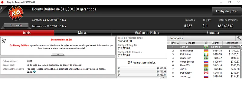 O jogador verde e amarelo cabeça25 foi um desses casos. Ele conquistou o Bounty builder $55 com 1,257 participantes e levou para o caixa $9,197, entre prêmio e bounties.