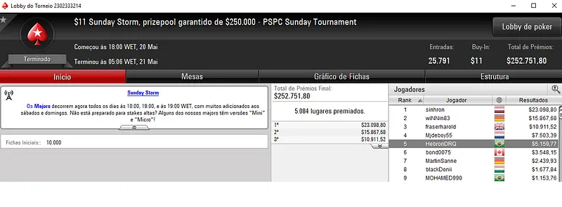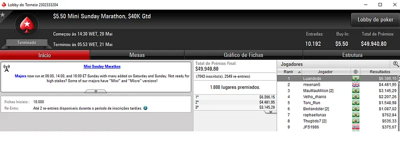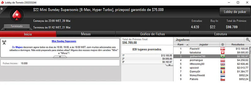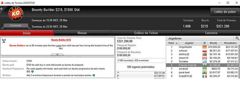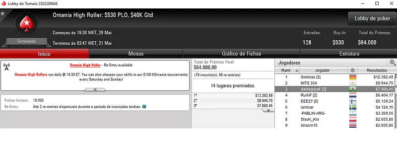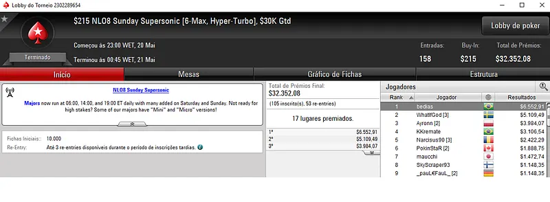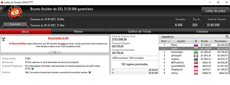 Já no Bigger $22, EdilsonRTJ teve direito a $20,230 pelo título, entre as 7,499 entradas registradas. O prize pool de $149,980 foi distribuído pelos 1,322 melhores classificados. A medalha de bronze ainda valeu $9,958 a ferlino1.