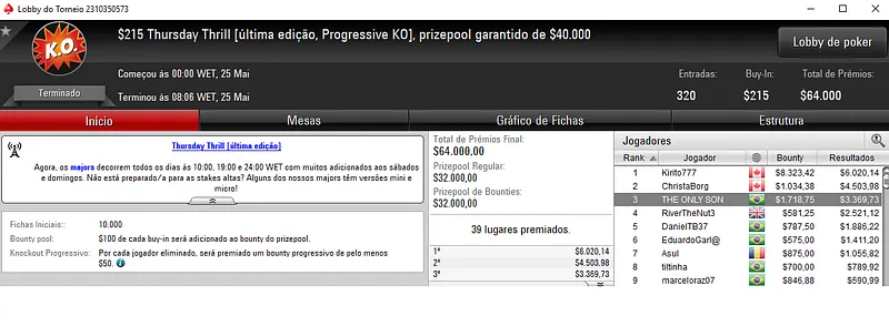 Gustavo "PIUlimeira" Goto foi o grande vencedor do dia ao conquistar o Thursday Thrill com 246 jogadores e $246,000 de prize pool. O craque não deu chances à concorrência e embolsou $51,096, entre prêmio e bounties. A mesa final deste torneios ainda contou com mais dois jogadores verde e amarelos. Caio Pessagno terminou na quarta colocação e forrou $12,393, enquanto Cassio "cassiopak" Killes foi oitavo classificado para embolsar $7,217.