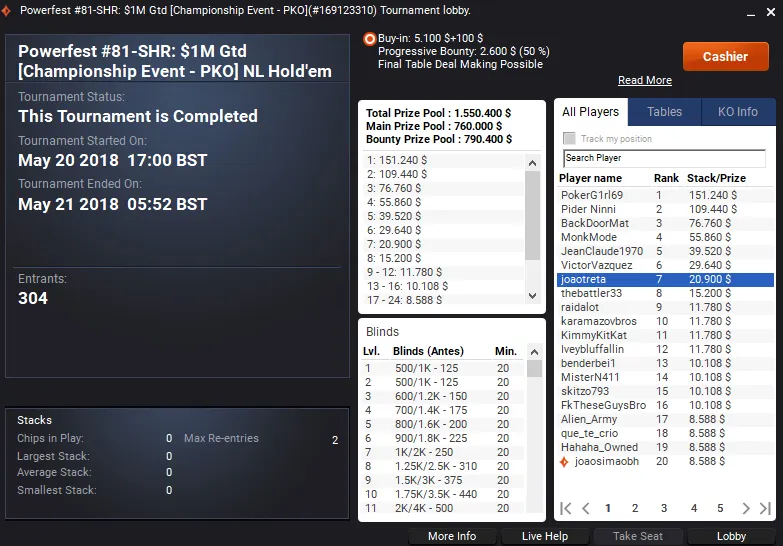ImReadyGambo comprova isso mesmo. Depois de sair com a medalha de bronze no Powerfest #83-HR embolsou "só" $62,837 de premiação. Este evento contou com 1,386 jogadores e o prize pool distribuído subiu aos $1,413,720.