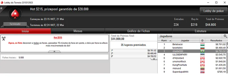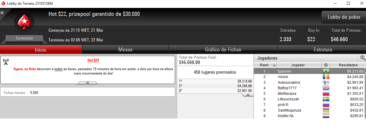 Já Adrovan "AadrovanRj21" Rodrigues saiu com o título e $6,672 de premiação no Hot $55, com 896 jogadores. O prize pol deste torneio chegou nos $44,800 e na terceira colocação, Gustavo "HoffmanGC" Hoffman ainda embolsou $3,256.