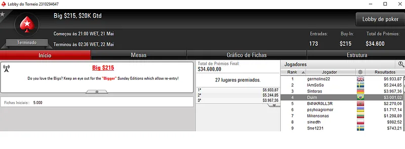 O Big $55 teve 953 jogadores e uma dobradinha brasileira. EdilsonRTJ acabou por cravar o torneio e embolsar $7,449, depois de eliminar JeF Dosso na segunda colocação para $5,279. O prize pool de $47,650 foi distribuído pelos 170 melhores classificados.