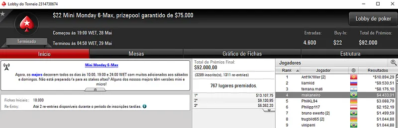 Dalton "daltonhb" Hobold não se pode queixar pois trouxe a maior forra do dia ao conquistar o Monday 6-Max com 592 entradas. O jogador nacional esteve em grande destaque nas mesas de poker online e embolsou $20,826 pelo primeiro lugar do pódio. Este evento premiou os 101 melhores classificados com parte dos $118,400 acumulados. Já a medalha de bronze deu direito a $10,111 de premiação a Ramon "ramonnce" Pessoa.