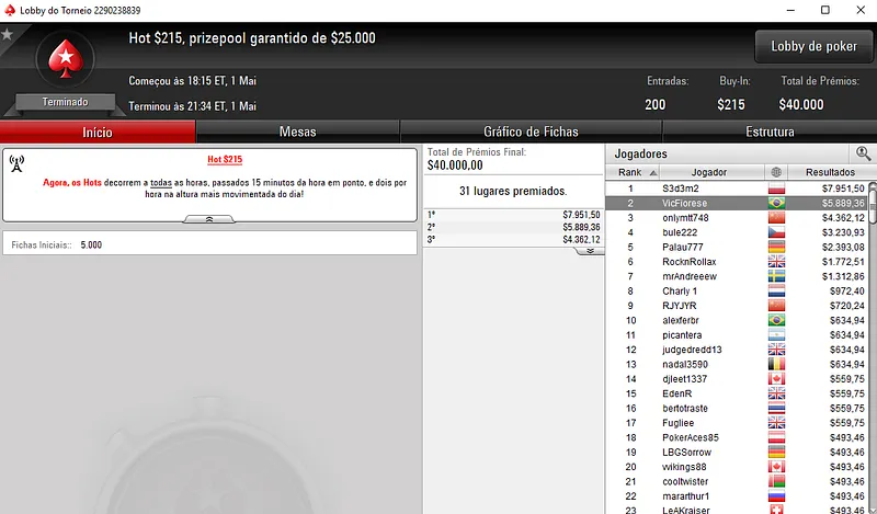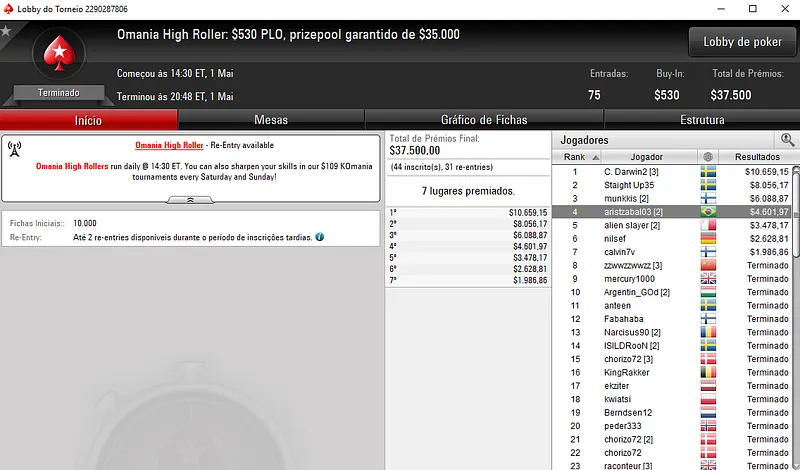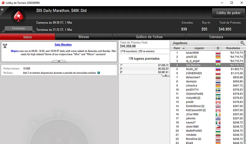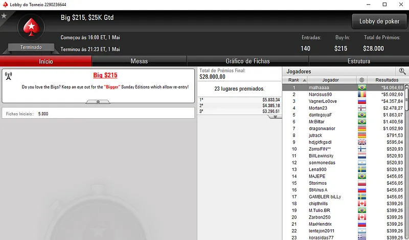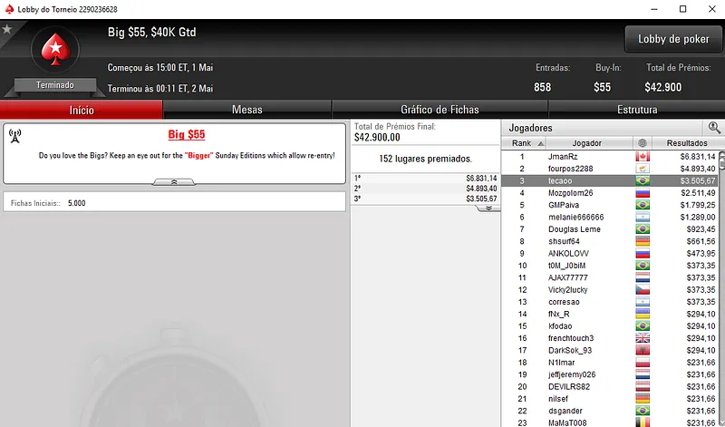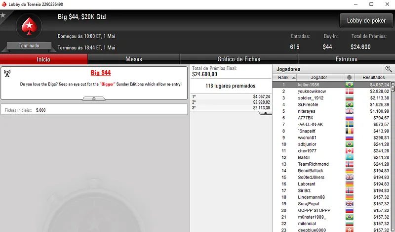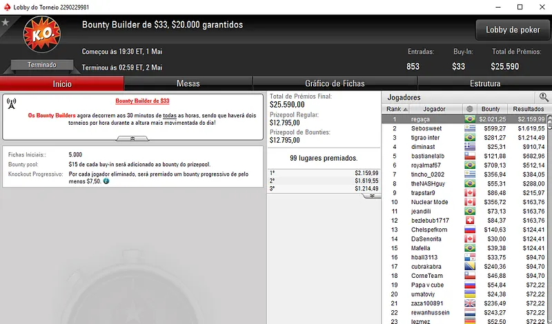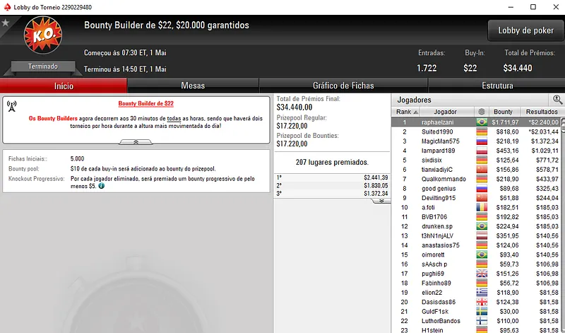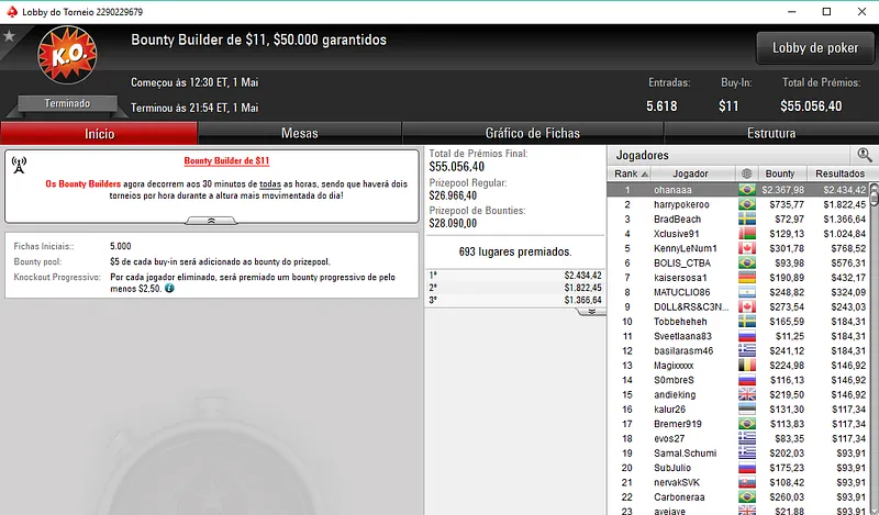 Já no Bounty Builder $55 houve dobradinha brasileira nas mesas. Com o primeiro lugar aestheticss recebeu $8,916, enquanto mantovan2 teve direito a $5,265, entre prêmio e bounties. Este torneio teve a participação de 1,208 jogadores e o prize pool chegou nos $60,400.