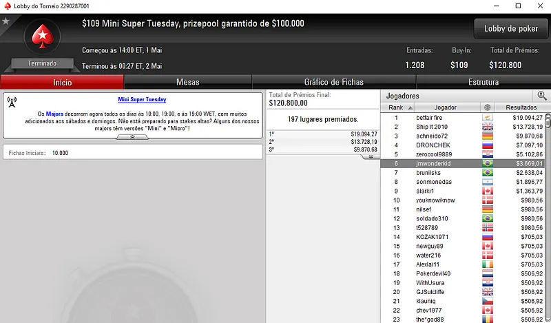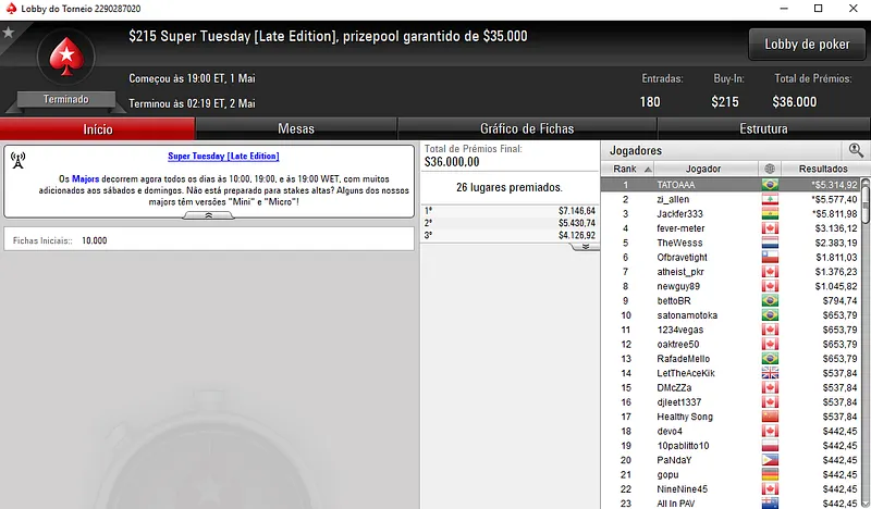 A terça-feira gorda deu novamente grandes premiações aos grinders nacionais. Ontem, o PokerStars voltou a ter grande afluência de jogadores nas mesas e você pode conferir aqui todos os vencedores: