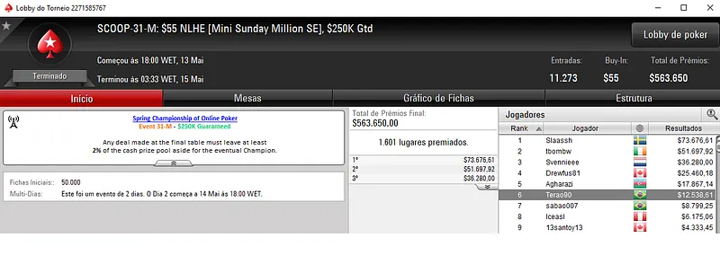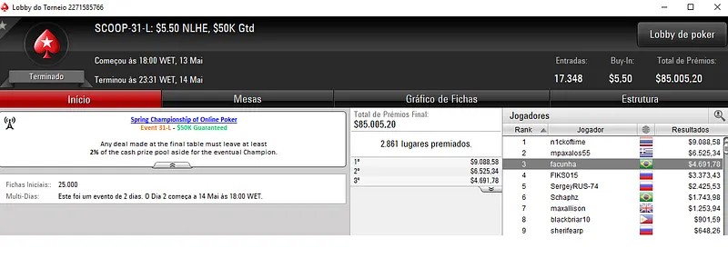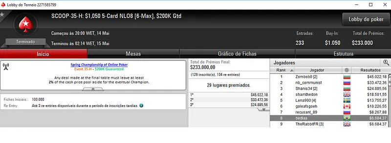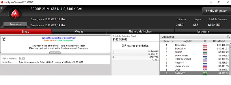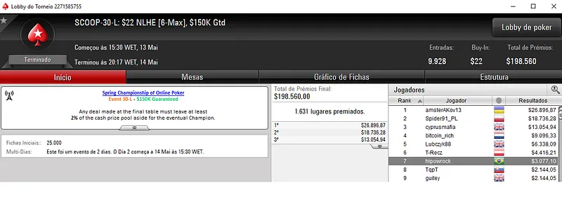 | Ter. Maio 15 | 10:00 | SCOOP-36-L - $5.50 NLHE [Deep Stacks] | $50,000 |