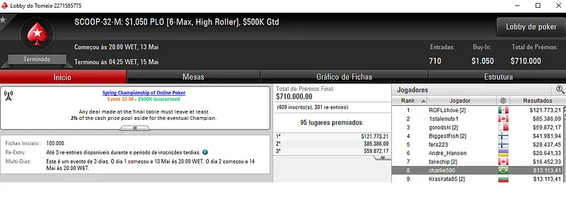 Mas não foi só. No SCOOP 29-Low, Guilherme “GhRibeiro” Ribeiro e sAArrAAdor fizeram a dobradinha e levaram os maiores prêmios em jogo. Guilherme foi campeão e forrou $10,362, enquanto sAArrAAdor teve direito a $5,376 de compensação. Aqui, participaram 11,504 jogadores e os prémios chegaram aos $112,739.